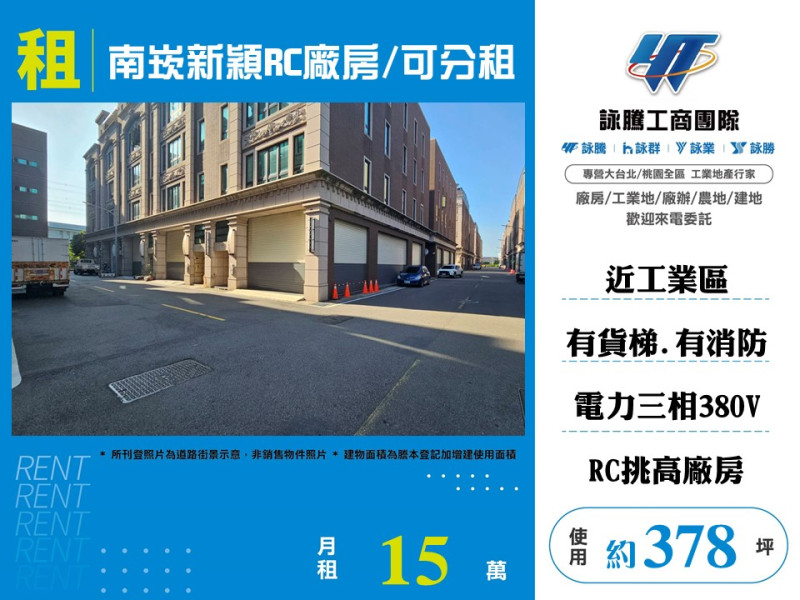 商品介紹:1.近南崁交流道,工業區,交通便利,好招工 2.新穎工業城RC挑高廠房,獨立地下室,基地後方約定專屬空間 樓層載重:1F-2T、2F-1T、以上500kg,增建一樓夾層約30坪,總使用面積約378坪 3.另計:管理費4200元、車位2個/管理費200元,機車位免費有4個位置 備註:合約一年一簽,可分租:B1、1樓、2樓,單一樓層租金5萬